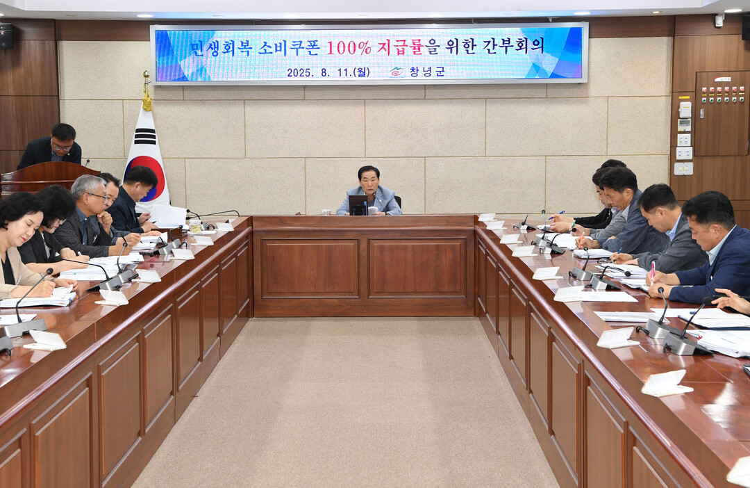 | ▲ 성낙인 군수가 11일 민생회복 소비쿠폰 지급률 제고를 위한 간부회의를 주재하고 있다. [창녕군 제공] |
