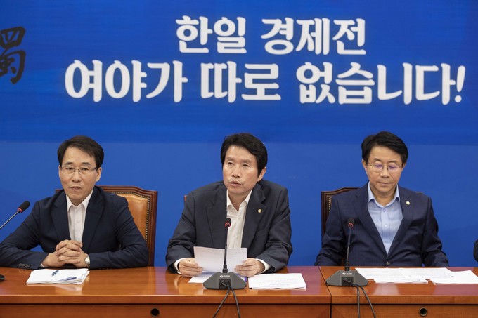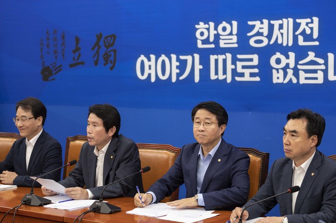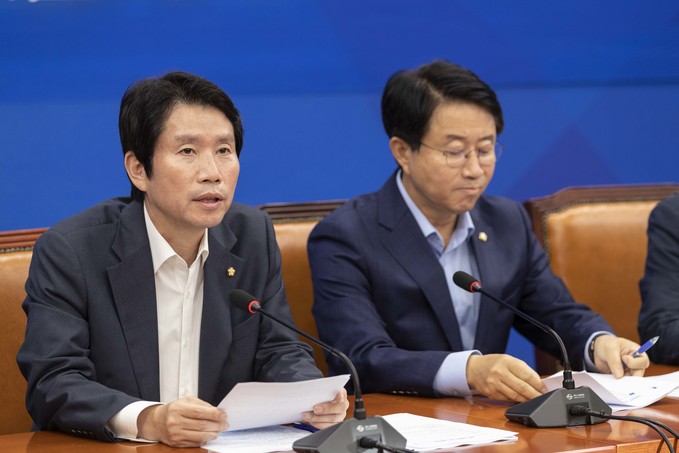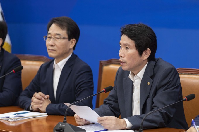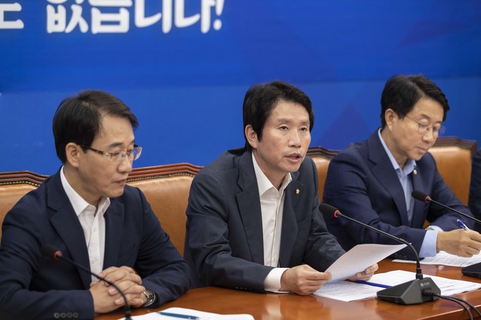 더불어민주당 이인영 원내대표(가운데)가 10일 오전 서울 여의도 국회에서 열린 민주당 원내대책회의에 참석해 발언하고 있다.
