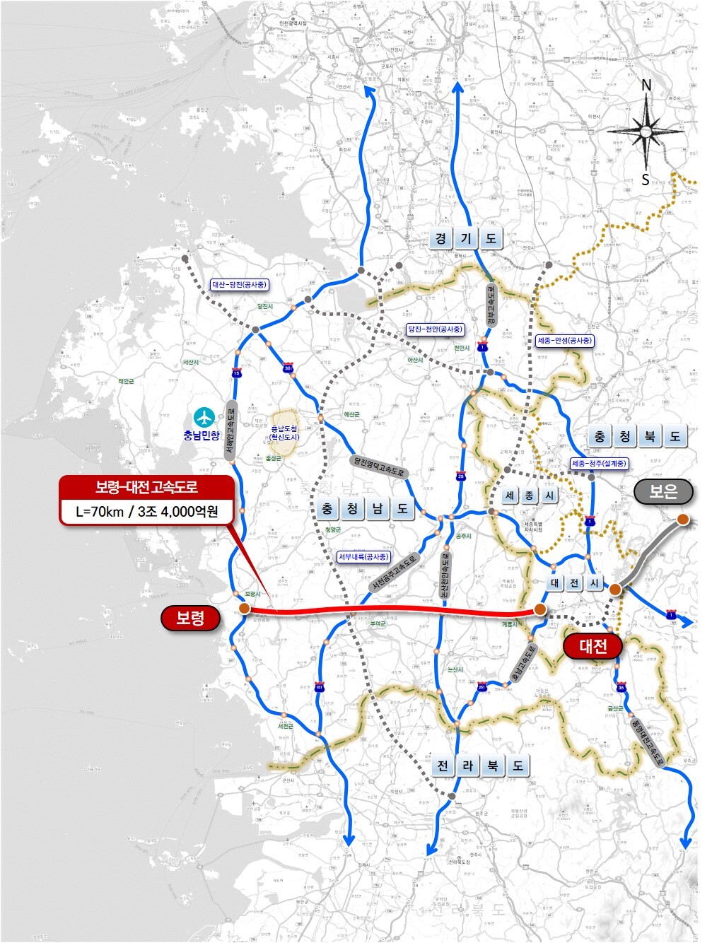 보령-대전 고속도로는 충청 동서축 고속도로 건설을 통한 △서해안 접근성 향상 △관광산업 및 물류 활성화 △균형적인 중부권 동서 고속도로망 구축 등을 위해 추진 중이다.
