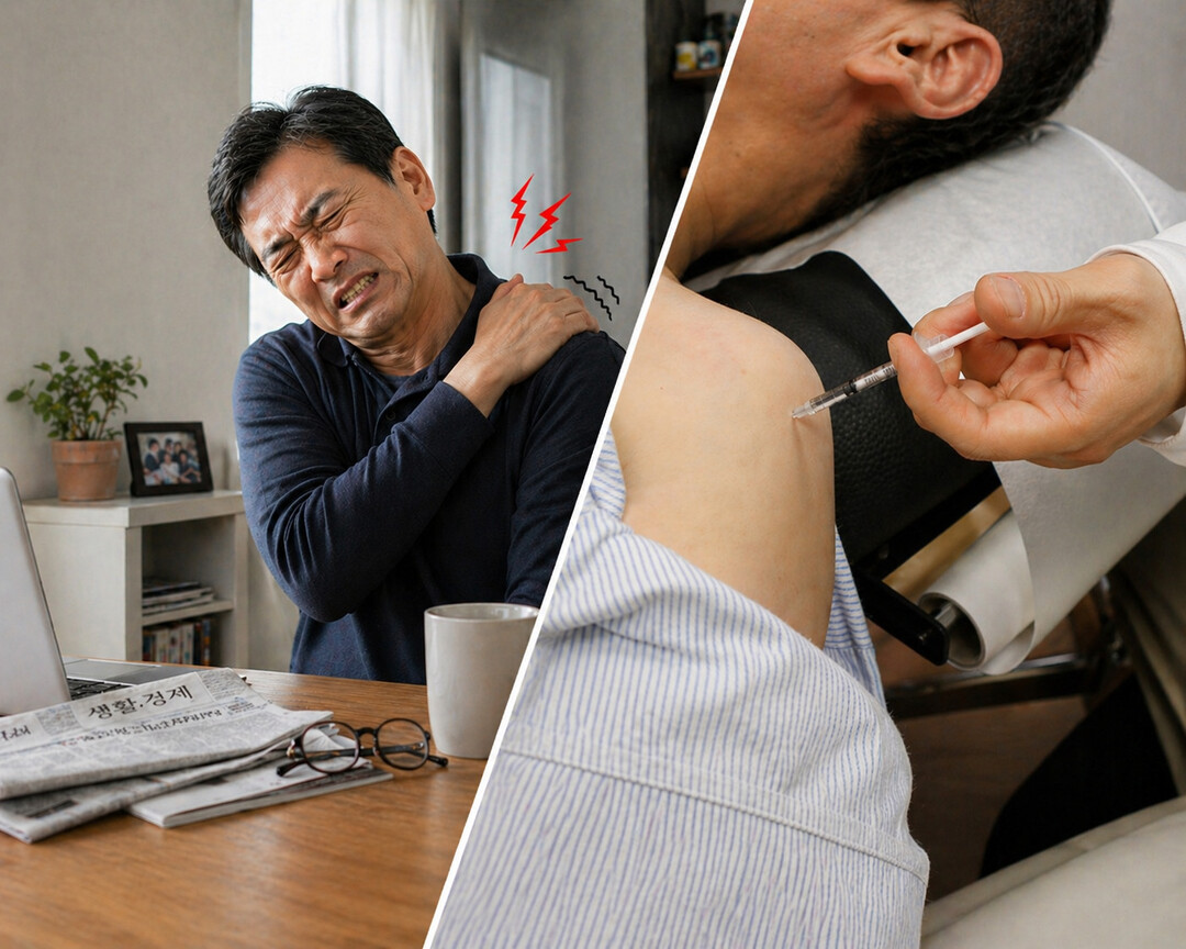 | ▲ 어깨 통증을 호소하는 오십견 환자가 약침치료를 받고 있는 모습. [챗GPT 생성] |