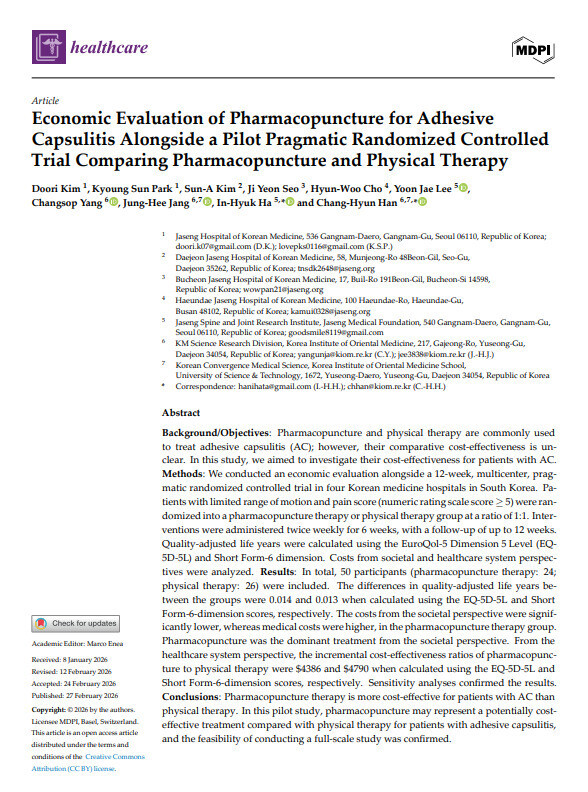 다만 이러한 상황 속, 유착성관절낭염에 대한 약침의 비용효과성을 평가한 연구는 전무한 상황이었다. 이에 김두리 원장 연구팀은 유착성관절낭염에 약침과 물리치료의 효과성과 안전성을 비교하는 파일럿 임상연구를 진행한 바 있으며, 해당 결과를 바탕으로 약침의 비용효과성을 평가했다.