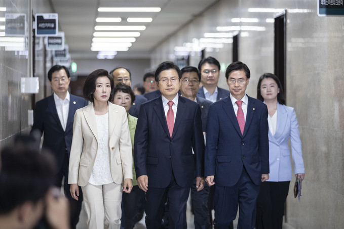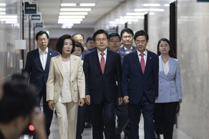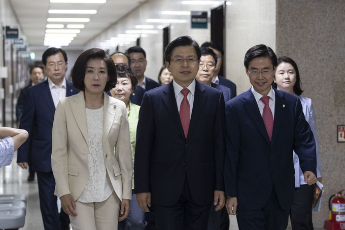 자유한국당 황교안 대표(가운데)와 나경원 원내대표가 27일 오전 서울 여의도 국회에서 열린 최고위원회의에 참석하기 위해 이동하고 있다.