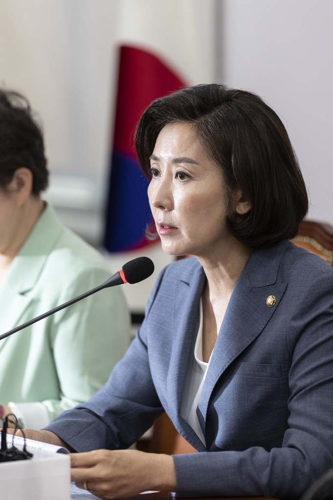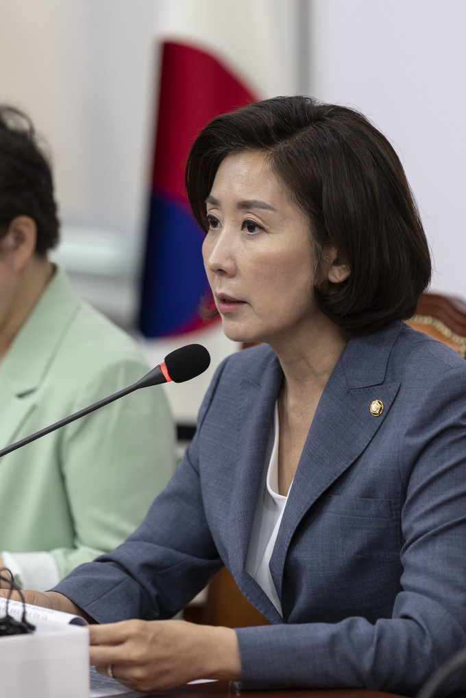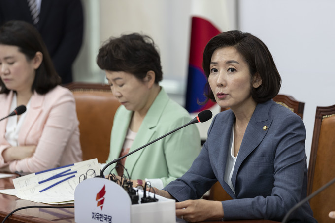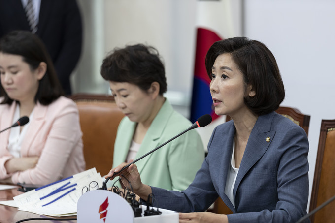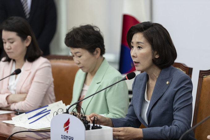 자유한국당 나경원 원내대표(오른쪽)가 15일 오전 서울 여의도 국회에서 열린 '한국당 최고위원회의'에 참석해 발언하고 있다.