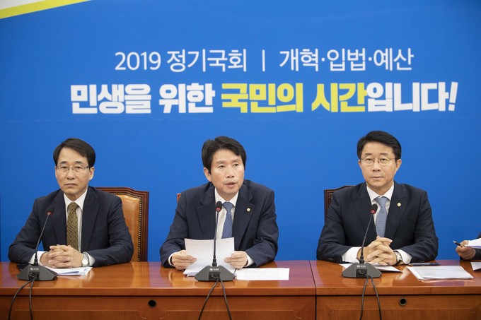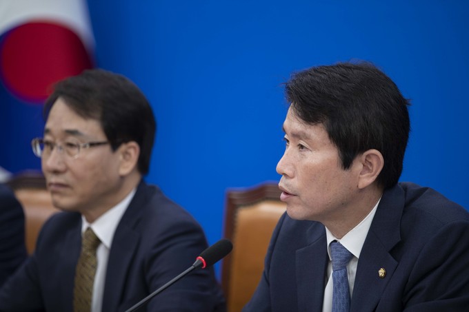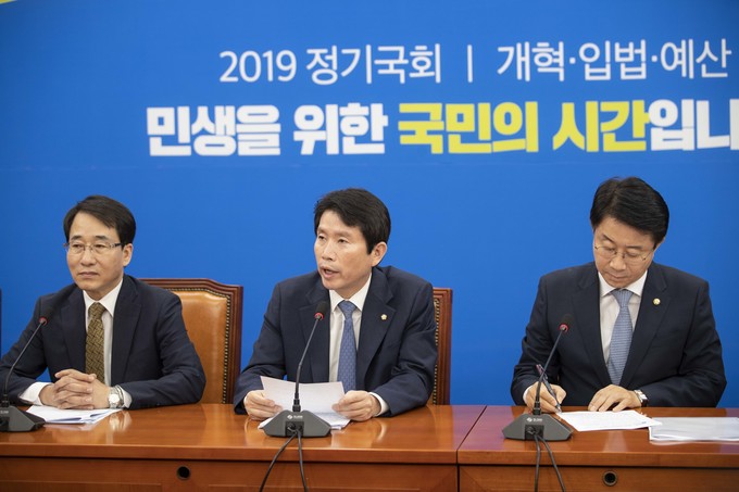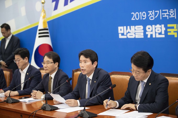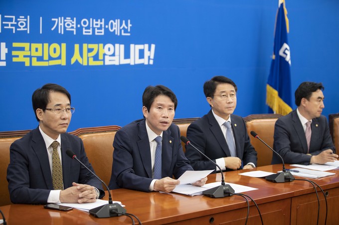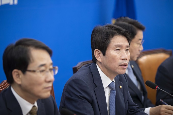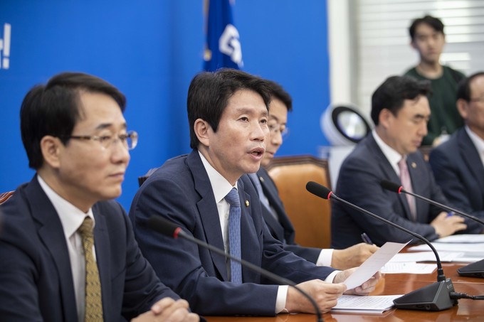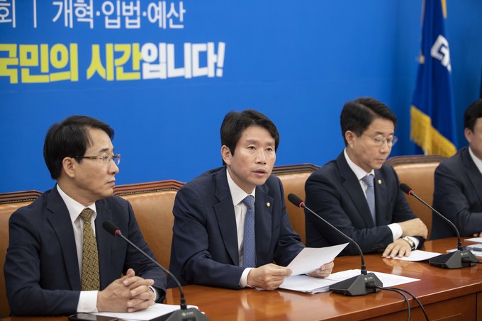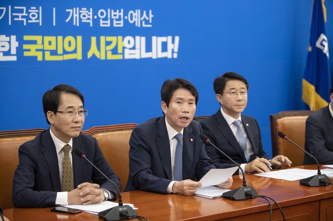 더불어민주당 이인영 원내대표(가운데)가 17일 오전 서울 여의도 국회에서 열린 민주당 원내대책회의에 참석해 발언하고 있다.