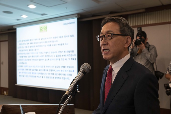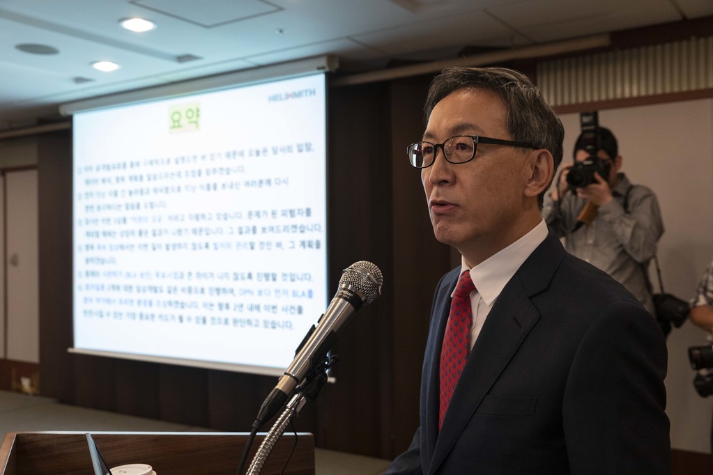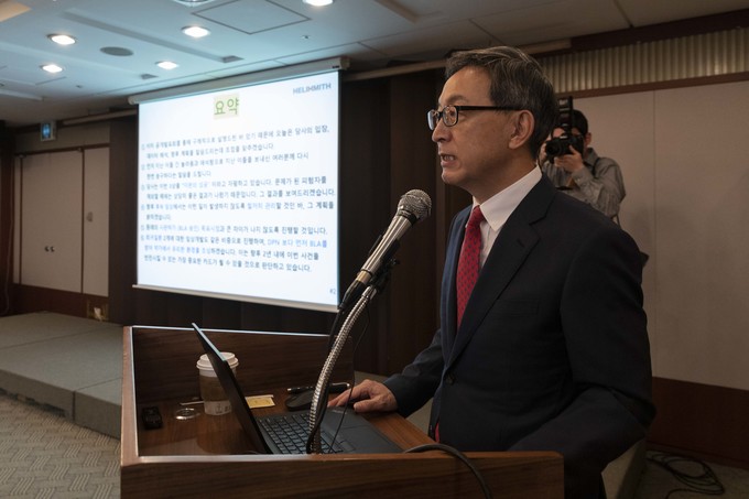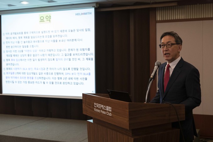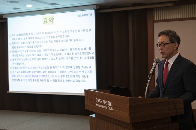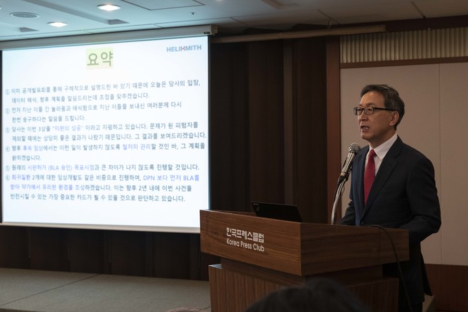 헬릭스미스 김선영 대표가 26일 오전 서울 중구 프레스센터에서 DPN3-1상 결과에 대해 발표하고 있다.