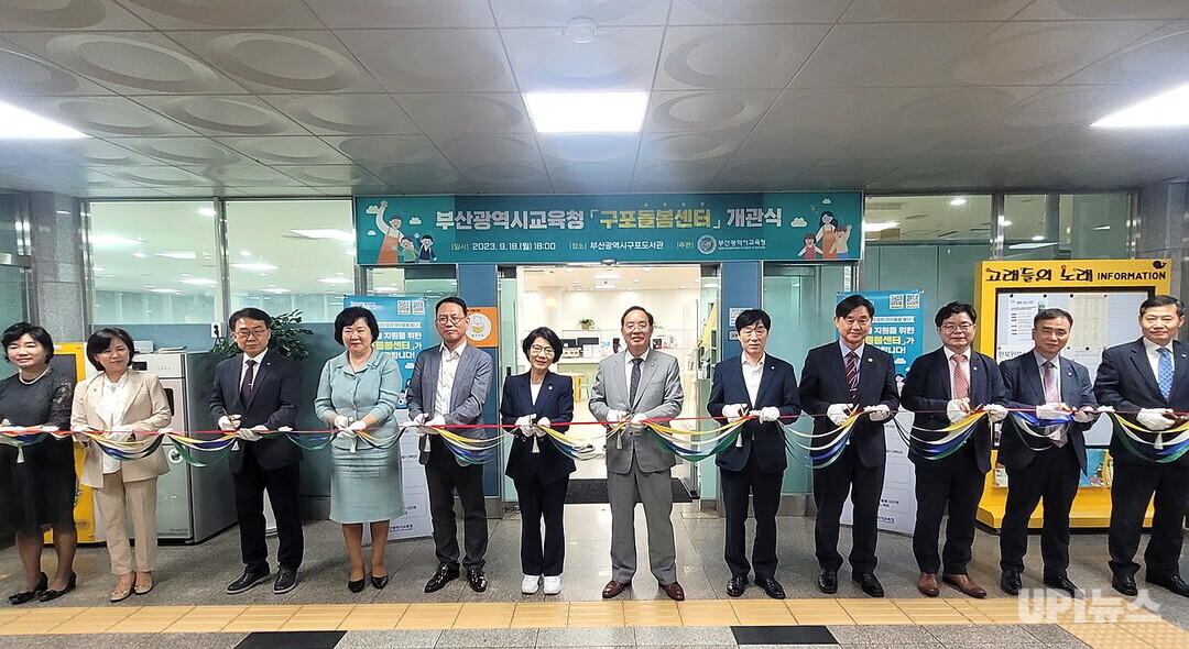 | ▲ 하윤수 교육감이 18일 교육청 간부들과 '구포돌봄센터’ 개관 테이프 커팅 행사를 열고 있다. [부산시교육청 제공] |