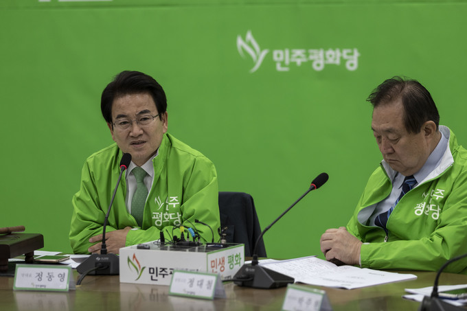 민주평화당 정동영 대표(왼쪽)가 15일 오전 서울 여의도 국회에서 열린 연석회의에 참석해 발언하고 있다.
