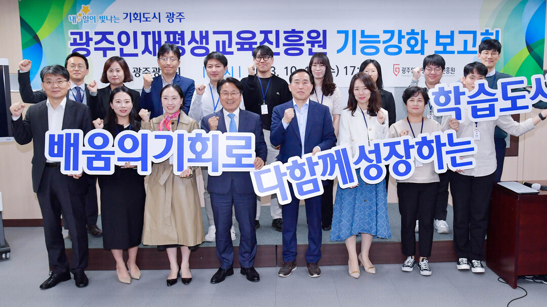 | ▲ 강기정 광주광역시장이 지난 18일 오후 광산구 광주인재평생교육진흥원을 방문해 이춘문 원장으로부터 업무보고를 받고 진흥원 기능강화에 대한 의견을 나눈 뒤 직원들과 기념촬영을 하고 있다.[광주광역시 제공] |