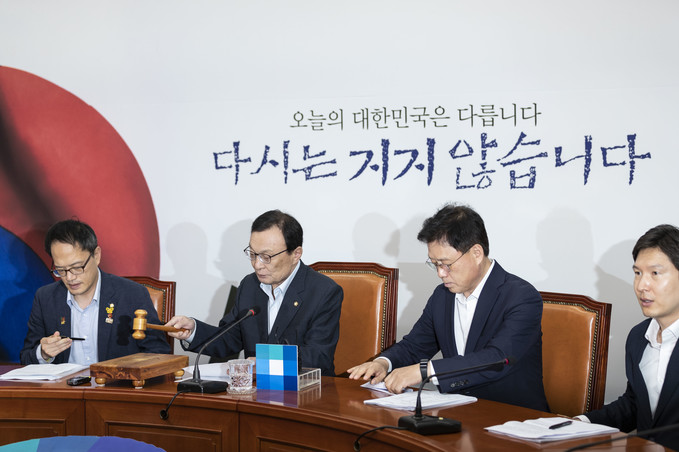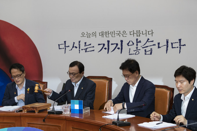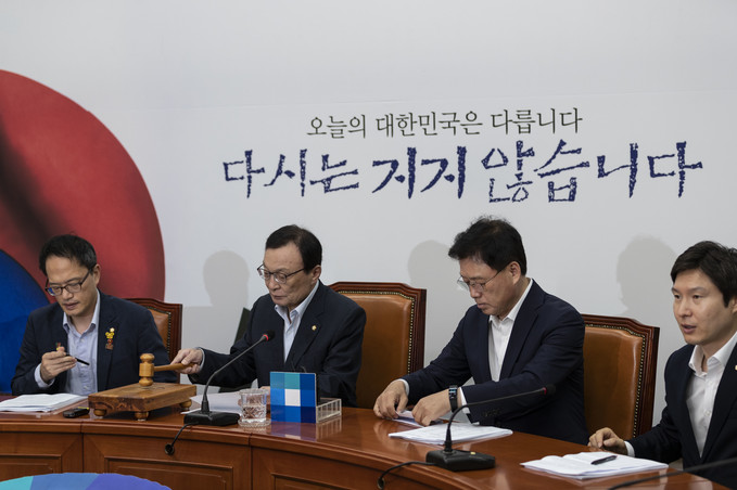 더불어민주당 이해찬 대표(왼쪽 두번째)가 5일 오전 서울 여의도 국회에서 열린 최고위원회의에서 의사봉을 두드리고 있다.
