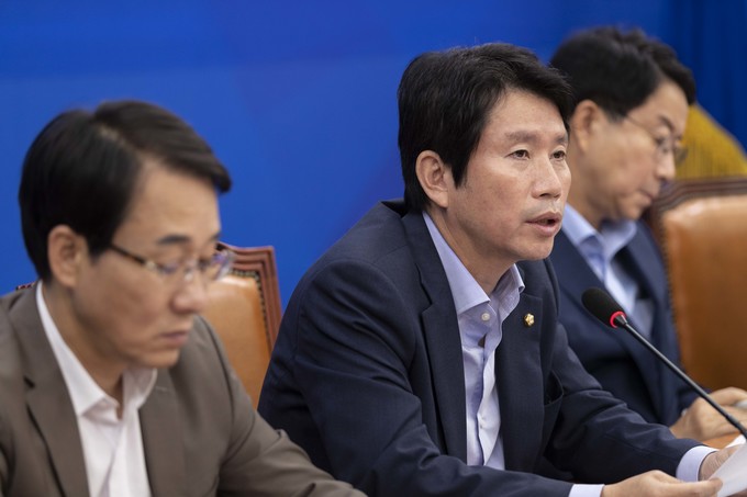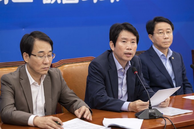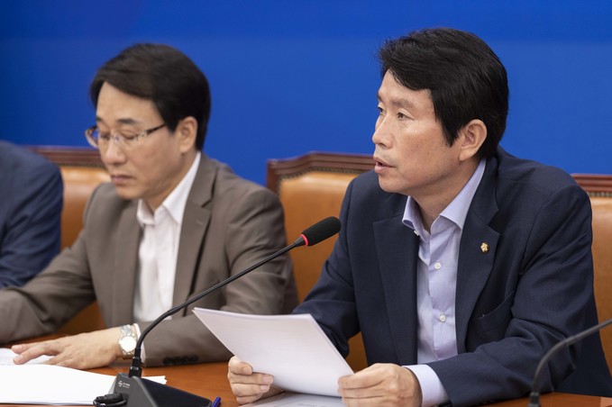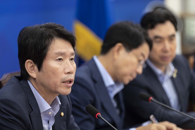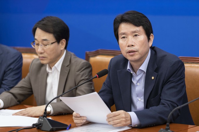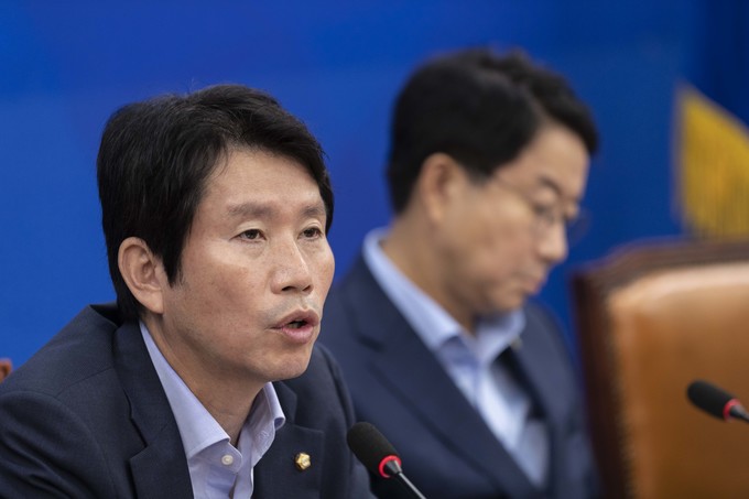 더불어민주당 이인영 원내대표(왼쪽)가 29일 오전 서울 여의도 국회에서 열린 민주당 정책조정회의에 참석해 발언하고 있다.