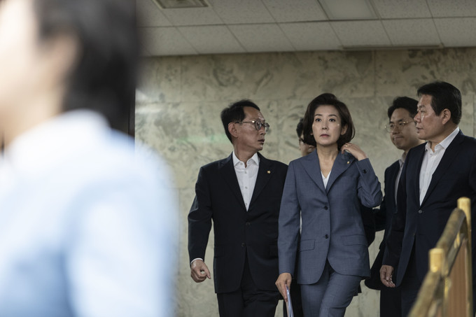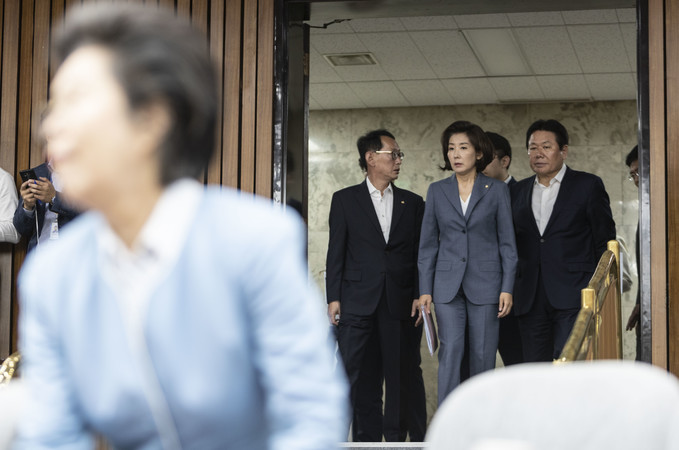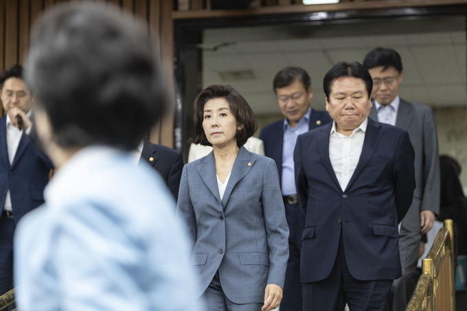 자유한국당 나경원 원내대표(가운데)가 9일 오전 서울 여의도 국회에서 열린 한국당 원내대책회의에 참석하고 있다.