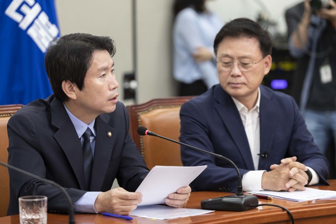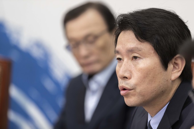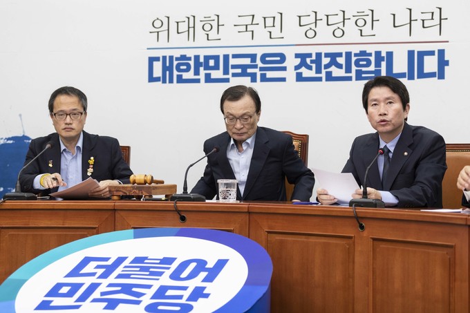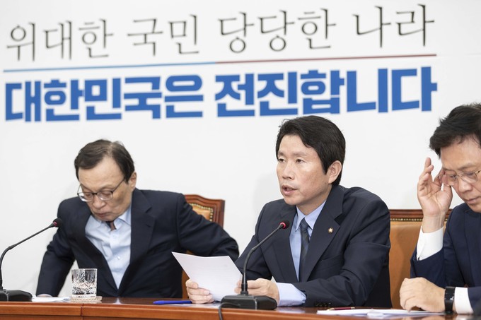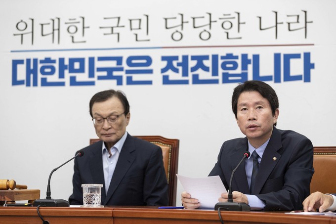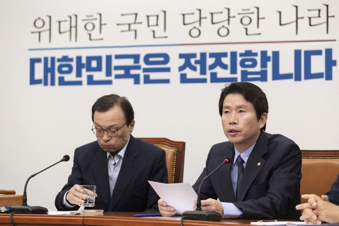 더불어민주당 이인영 원내대표(오른쪽)가 30일 오전 서울 여의도 국회에서 열린 민주당 최고위원회의에 참석해 발언하고 있다.
