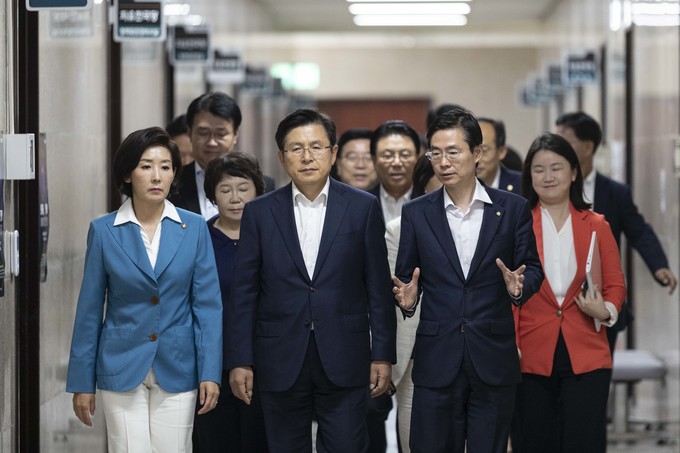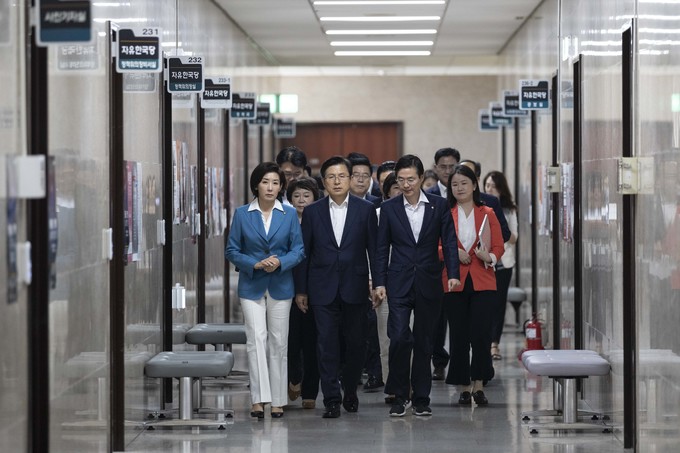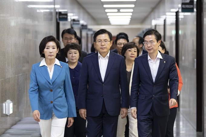 자유한국당 황교안 대표(가운데)와 나경원 원내대표가 22일 오전 서울 여의도 국회에서 열린 한국당 최고위원회의에 참석하고 있다.