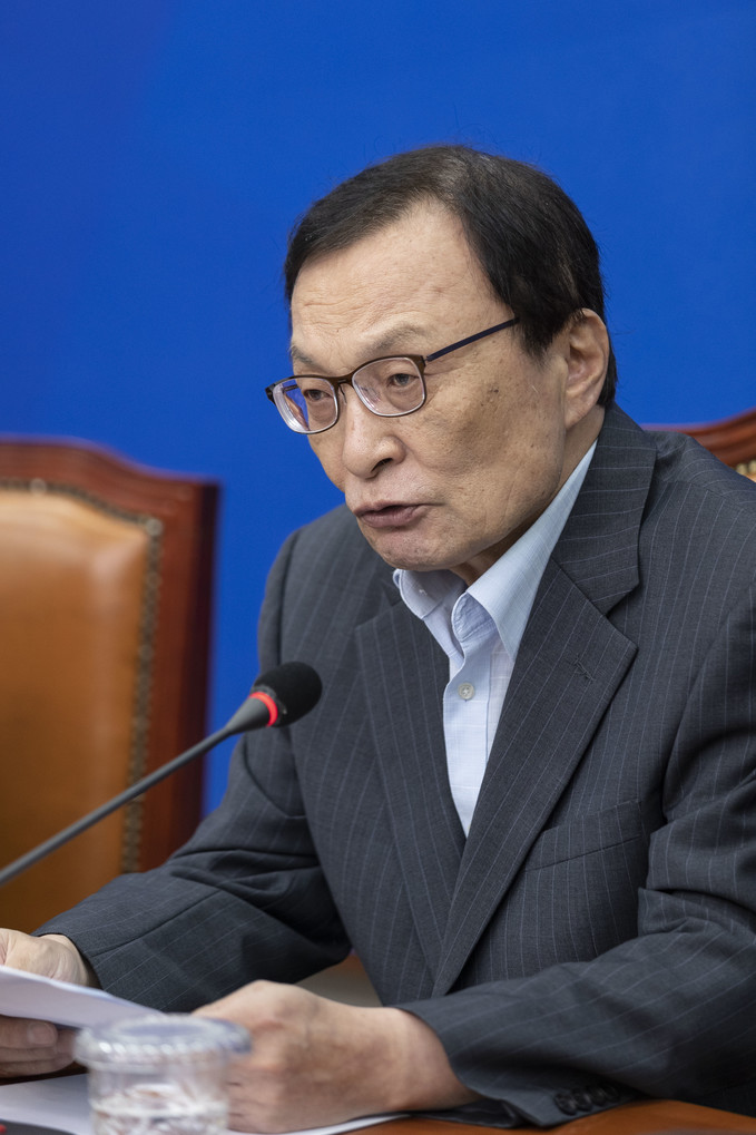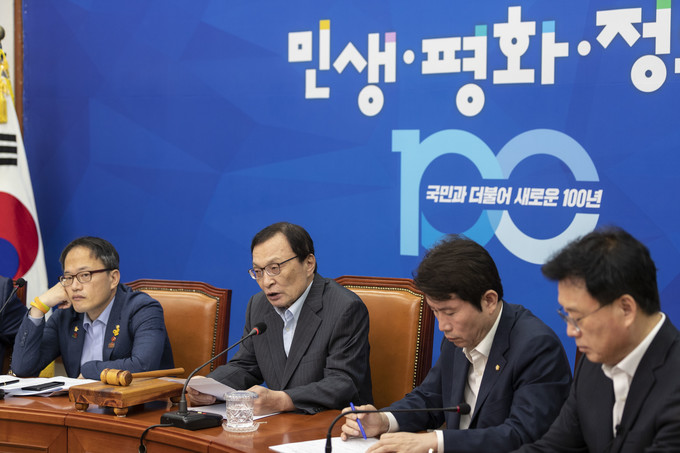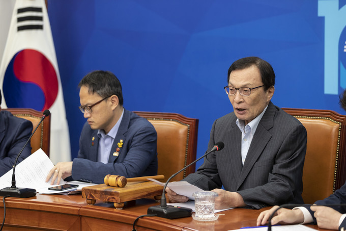 더불어민주당 이해찬 대표(왼쪽 두번째)가 15일 오전 서울 여의도 국회에서 열린 최고위원회의에 참석해 발언하고 있다.