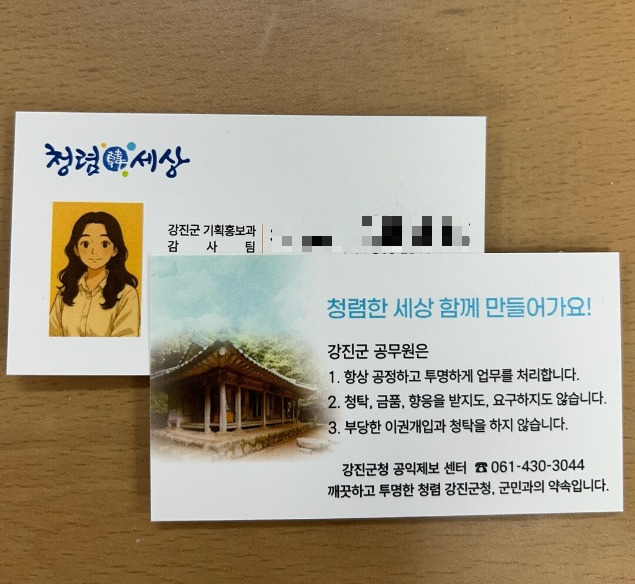 뒷면에는 강진군 공익제보센터 전화번호와 함께 청탁금지와 투명한 업무 처리 등 청렴 실천을 다짐하는 문구를 담아, 명함을 받은 민원인이 공직자의 청렴 의지를 체감하고 부조리 행위에 접근·신고할 수 있도록 했다.