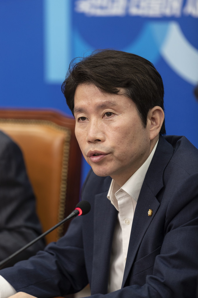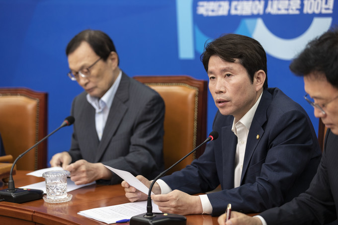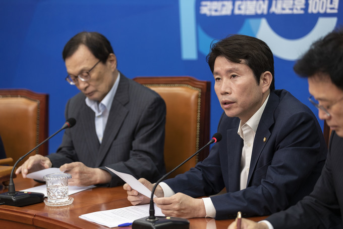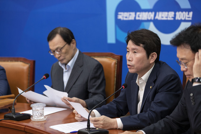 더불어민주당 이인영 원내대표(가운데)가 15일 오전 서울 여의도 국회에서 열린 최고위원회의에 참석해 발언하고 있다.