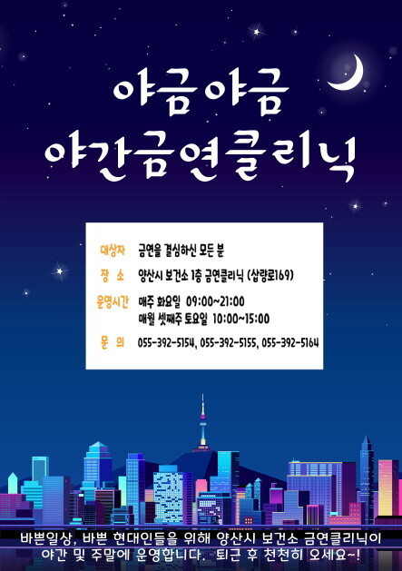 양산시보건소는 최근 시범 운영한 야간 시간대 금연 클리닉 '야금야금'의 운영을 본격적으로 시작한다.