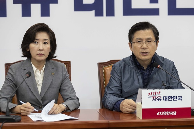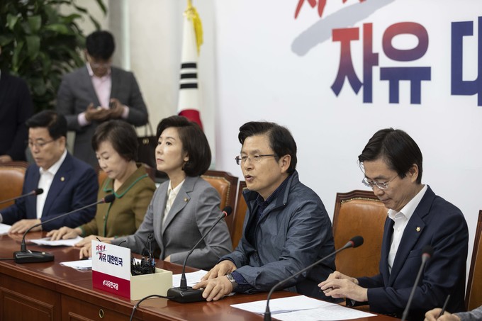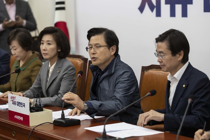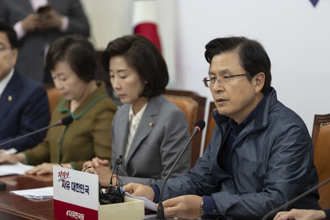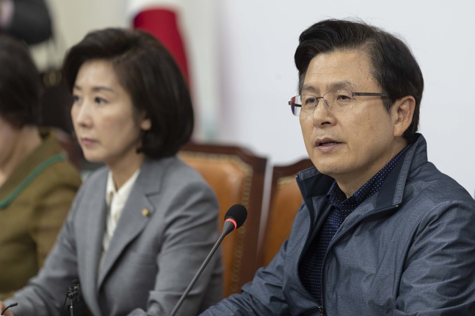 자유한국당 황교안 대표(오른쪽)가 16일 오전 서울 여의도 국회에서 열린 한국당 최고위원회의에 참석해 발언하고 있다.