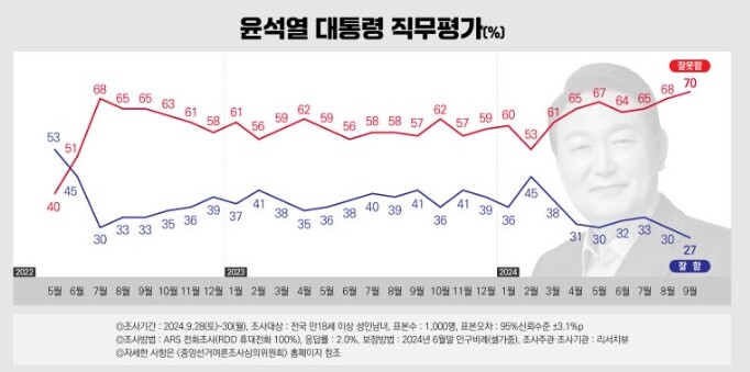 윤 대통령 지지율 하락은 김건희 여사 관련 의혹과 의료공백에 대한 부정적 여론이 높기 때문이다. 두 현안 모두 윤 대통령이 직접 풀어야 할 것들이다. 이를 위해선 전향적인 인식 전환이 필요하다.