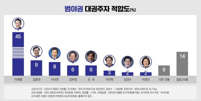 범야권 차기 대권주자 적합도에서는 더불어민주당 이재명 대표가 45%로 독주했다. 직전 조사 대비 1%p 올랐다. 김동연 경기지사는 2%p 오른 9%였다.