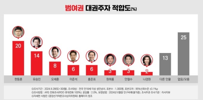 오세훈 서울시장은 1%p 상승해 8%였다. 개혁신당 이준석 의원은 2%p 빠진 6%였다.