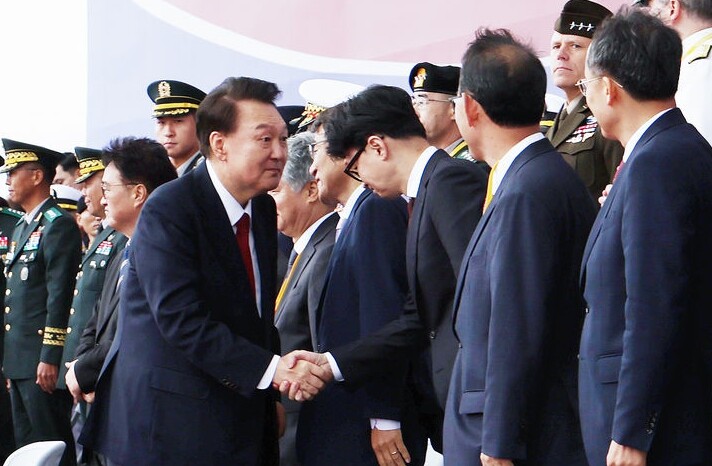 | ▲ 윤석열 대통령이 지난 1일 성남 서울공항에서 열린 건군 제76주년 국군의날 기념식을 마친 뒤 퇴장하며 한동훈 국민의힘 대표와 악수하고 있다. [뉴시스] |