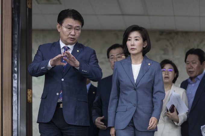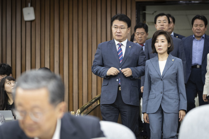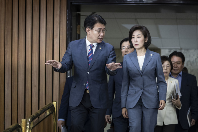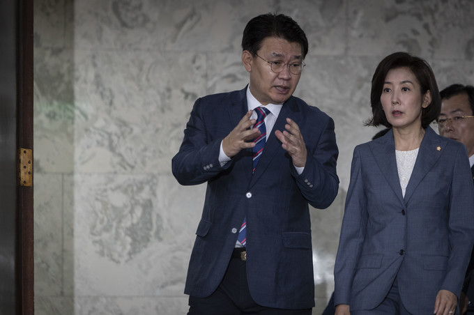 자유한국당 나경원 원내대표(오른쪽)와 정용기 의원이 2일 오전 서울 여의도 국회에서 열린 원내대책회의에 참석하고 있다.