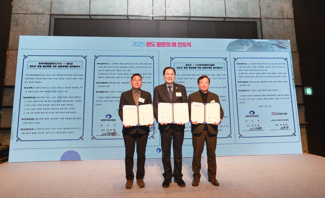 | ▲ 신우철 완도군수가 지난 21일 더 플라자 서울 호텔에서 '2025 완도 방문의 해' 선포식을 갖고 한국여행업협회와 (사)한국여행작가협회 등과 관광객 유치를 위한 협약을 하고 있다. [완도군 제공] |