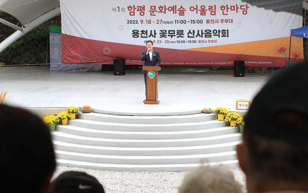 | ▲ 지난 23일 이상익 함평군수가 제1회 용천사 꽃무릇 산사 음악회와 함평 문화예술 어울림 한마당에서 인사말을 하고 있다. [함평군 제공] |