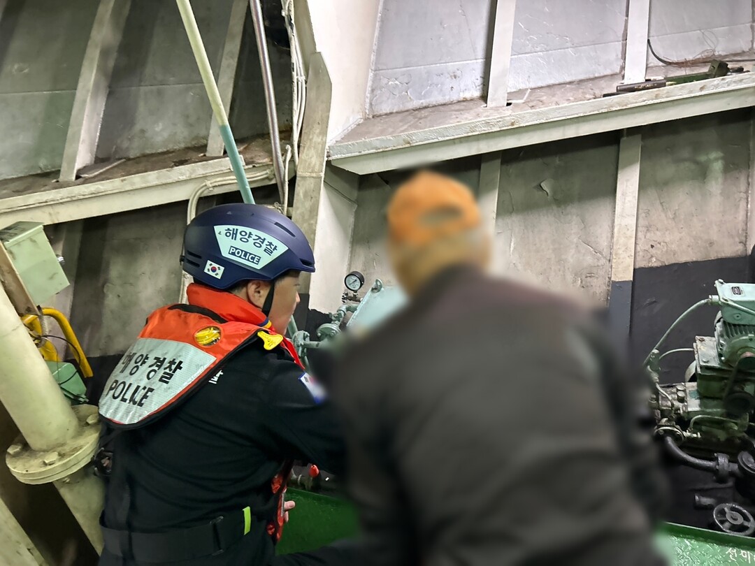 | ▲ 여수해경이 제주선적 화물선 기관장에게 분뇨 불법 배출에 대해 수사를 하고 있다. [여수해경 제공] |