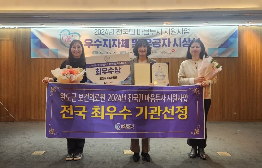 전남 완도군이 보건복지부 '2024년 전 국민 마음 투자 지원사업' 평가에서 최우수 지자체로 선정됐다고 17일 밝혔다.