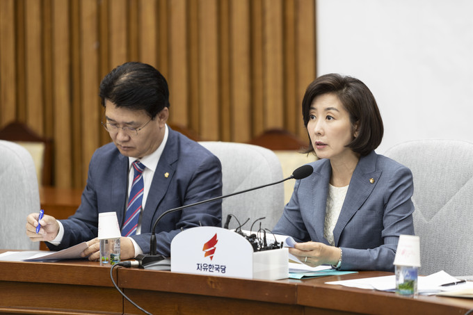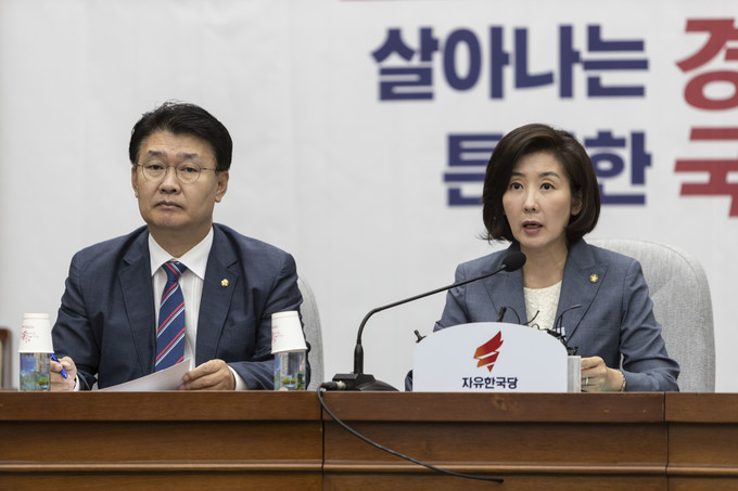 자유한국당 나경원 원내대표(오른쪽)가 2일 오전 서울 여의도 국회에서 열린 원내대책회의에 참석해 발언하고 있다.