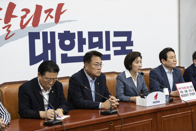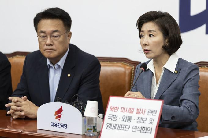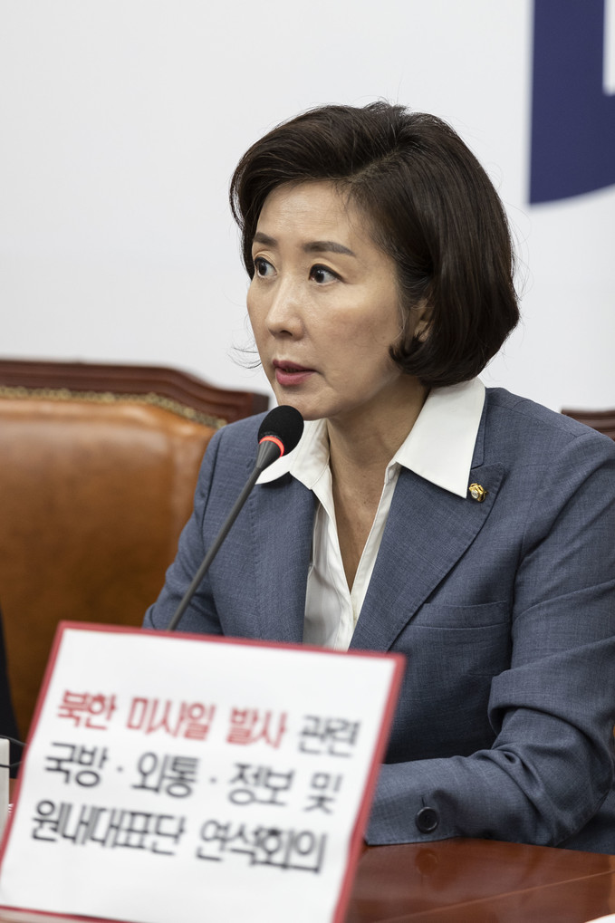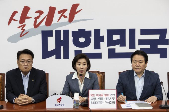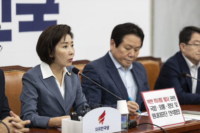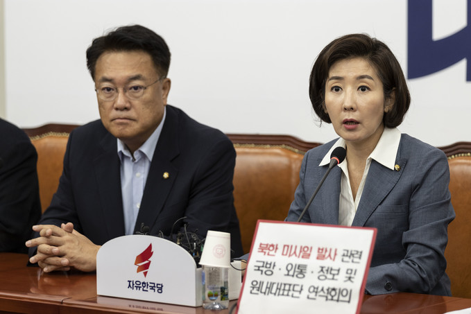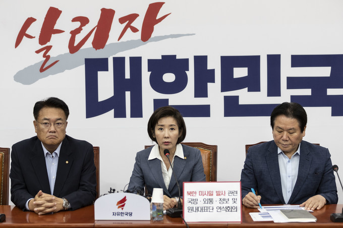 자유한국당 나경원 원내대표(가운데)가 31일 오전 서울 여의도 국회에서 열린 '북한 미사일 발사 관련 국방·외통·정보 및 원내대표단 연석회의'에 참석해 발언하고 있다.