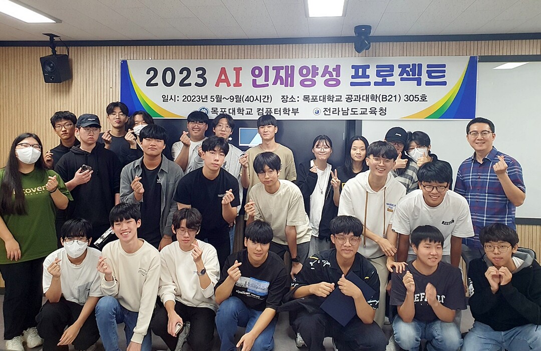 국립목포대학교 컴퓨터학부가 지난 23일 도림캠퍼스 공학관 305호에서 도내 18개 고등학교에서 선발된 31명을 대상으로 실시한 ‘2023 AI 인재양성 프로젝트 과정’을 모두 마치고 수료생 25명을 배출했다고 밝혔다.