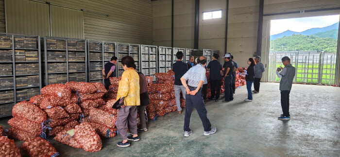 산청군농업협동조합이 주관한 이번 수매는 생초면 마늘작목반 60여 농가가 출하한 건마늘 2000망, 40t 규모다. 수매가격은 상품 기준 1㎏당 3800~4000원으로, 지난해보다 소폭 상승했다.