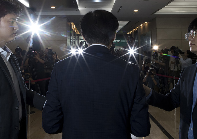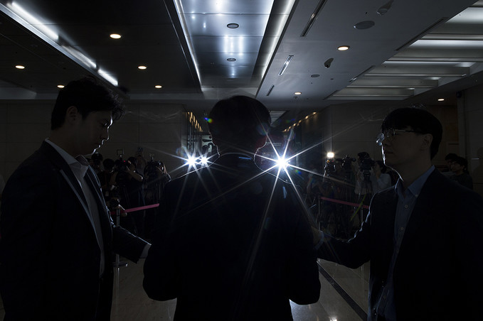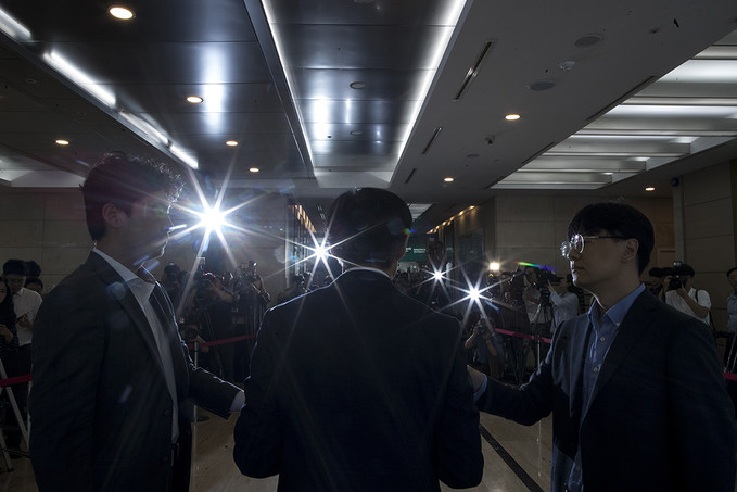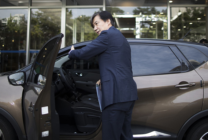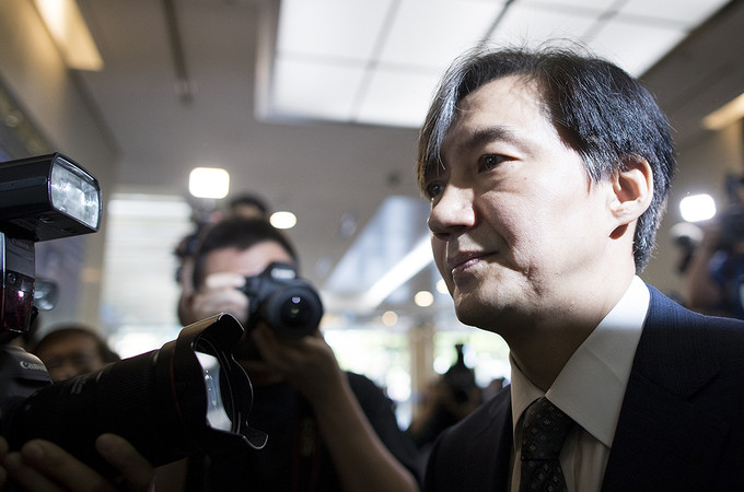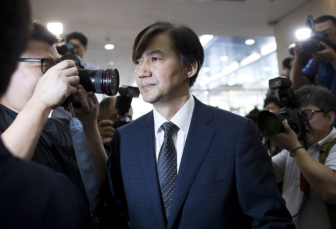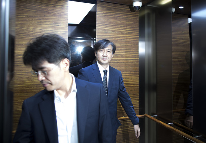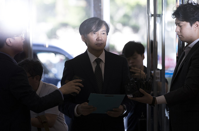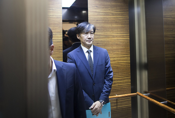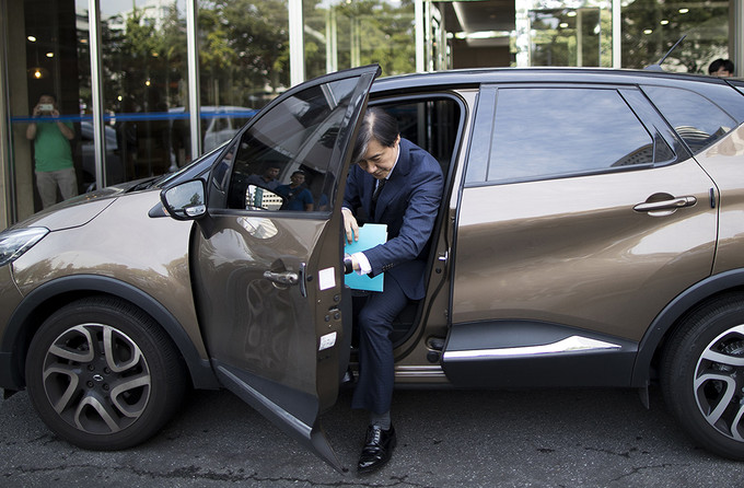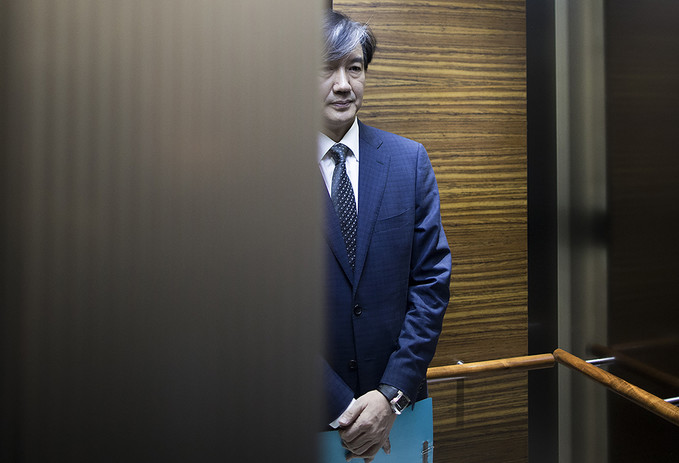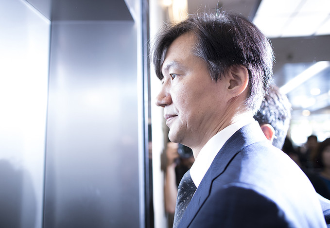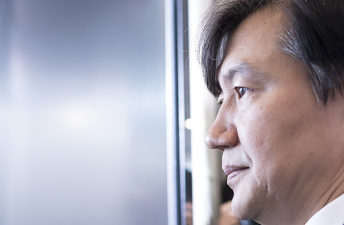 조국 법무부 장관 후보자가 22일 오전 인사청문회 준비 사무실이 마련된 서울 종로구 적선현대빌딩으로 출근하고 있다.