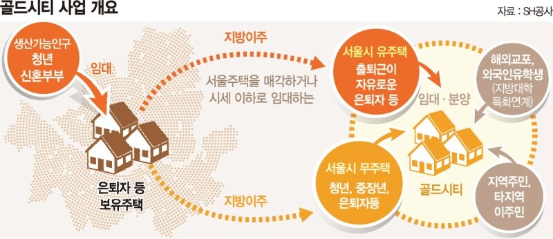 골드시티는 소멸 위기 지방도시 활성화와 서울 주거 문제를 동시에 해소하기 위해 서울시가 도입·추진 중인 사업이다. 지방으로의 인구 유입과 지역경제 활성화, 서울 지역 청년·신혼부부 주택난 완화 등의 효과가 기대된다.