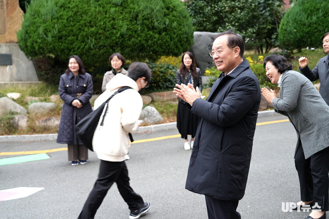 | ▲ 하윤수 교육감이 16일 아침 경남공고 시험장 앞에 나가서 입장하는 수험생을 격려하고 있다. [부산시교육청 제공] |