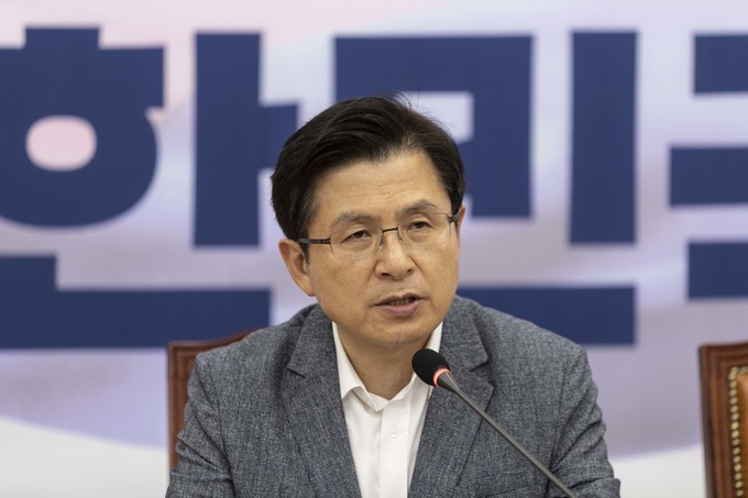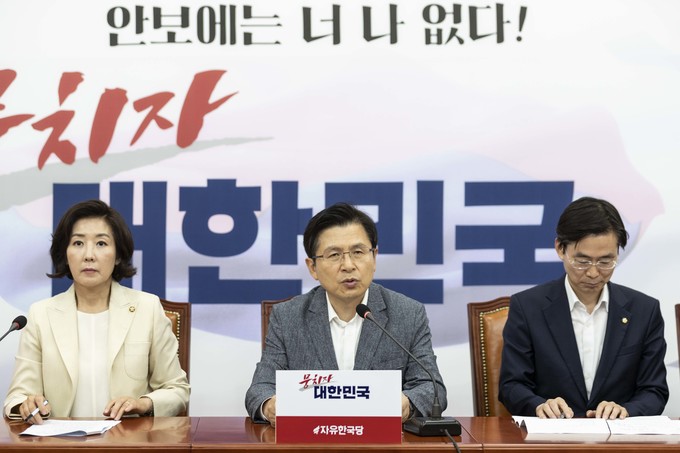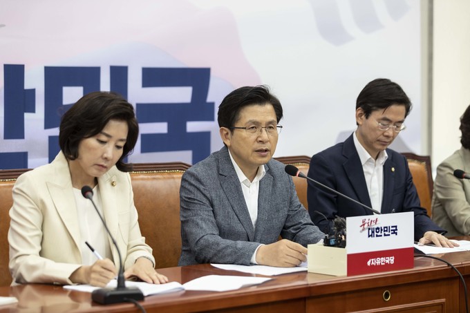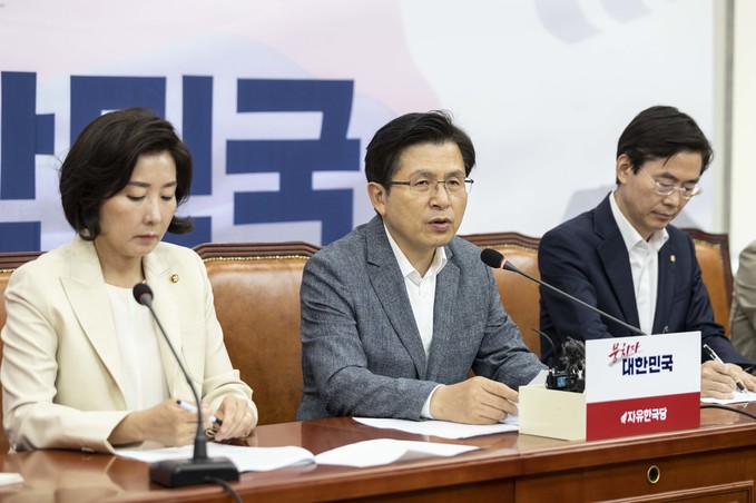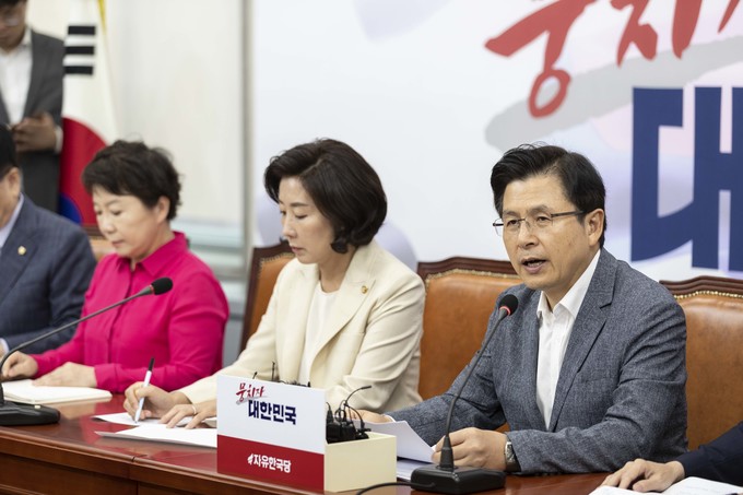 자유한국당 황교안 대표(가운데)가 26일 오전 서울 여의도 국회에서 열린 한국당 최고위원회의에 참석해 발언하고 있다.
