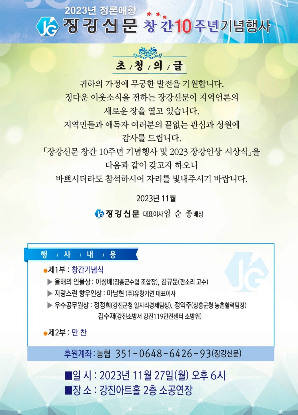 전남 강진과 장흥지역 풀뿌리 언론인 '장강신문'이 27일 오후 6시 창간 10주년을 맞이해 기념식과 2023 장강인상 시상식을 개최한다.