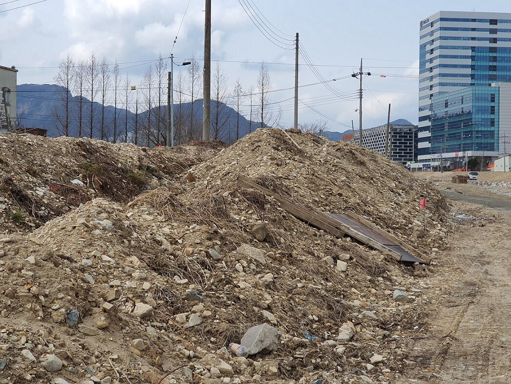 | ▲방진덮개 시설없이 대전 화산천변에 야적된 토사.[대전시 제공]. |