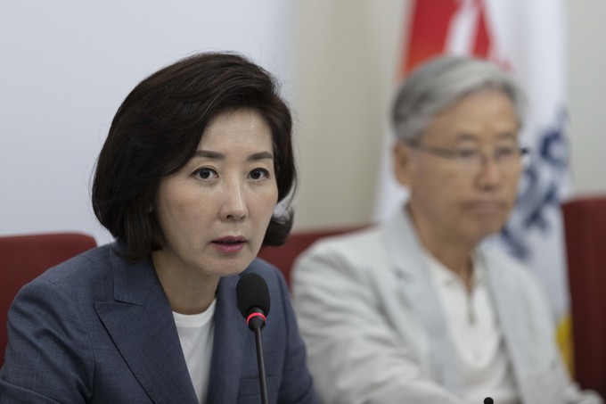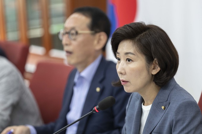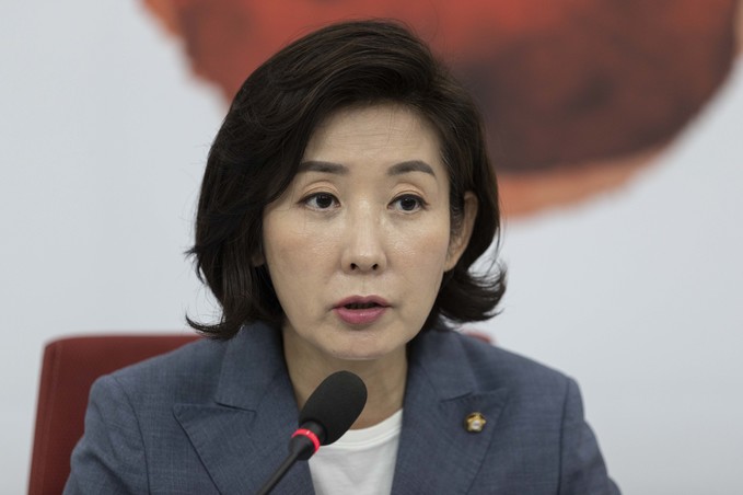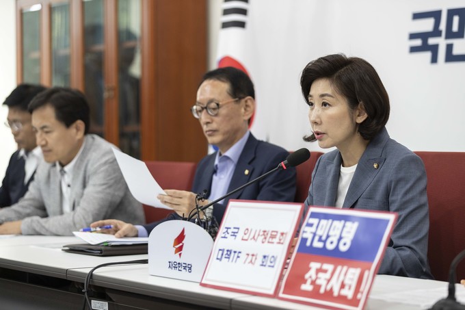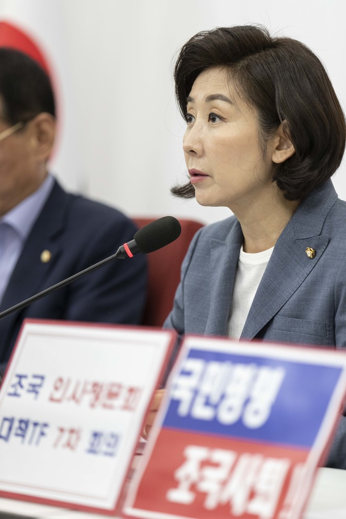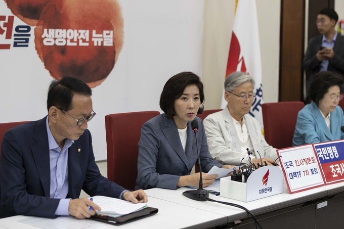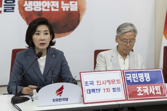 자유한국당 나경원 원내대표(왼쪽)가 27일 오전 서울 여의도 국회에서 열린 조국 인사청문회 대책TF 회의에 참석해 발언하고 있다.