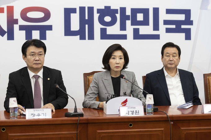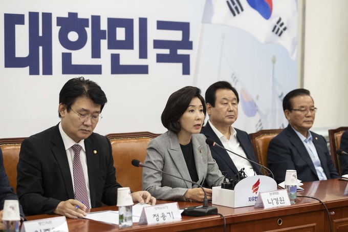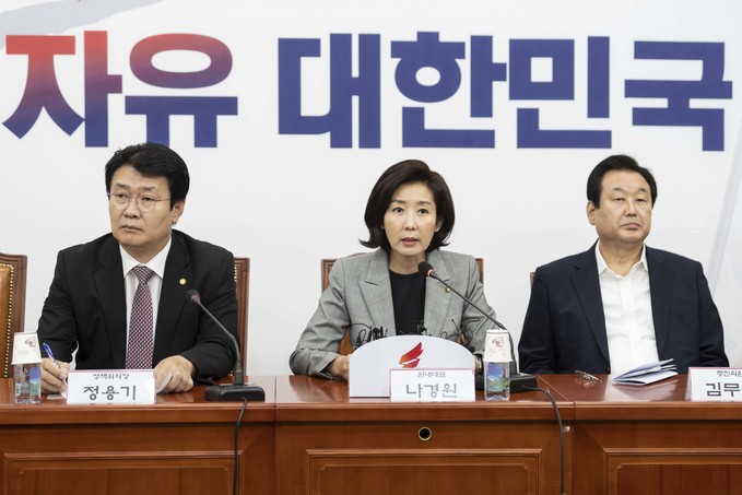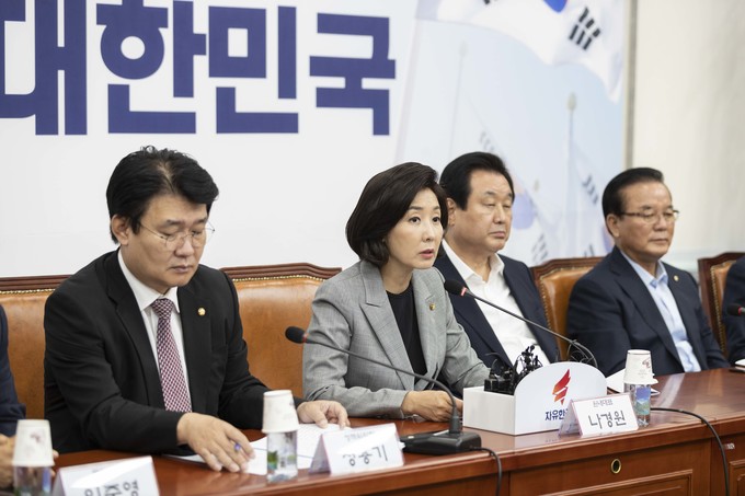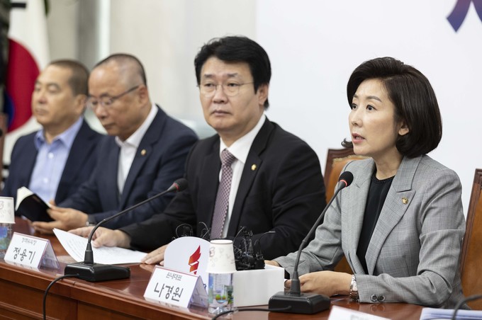 자유한국당 나경원 원내대표(가운데)가 25일 오전 서울 여의도 국회에서 열린 한국당 원내대표-중진의원 회의에 참석해 발언하고 있다.