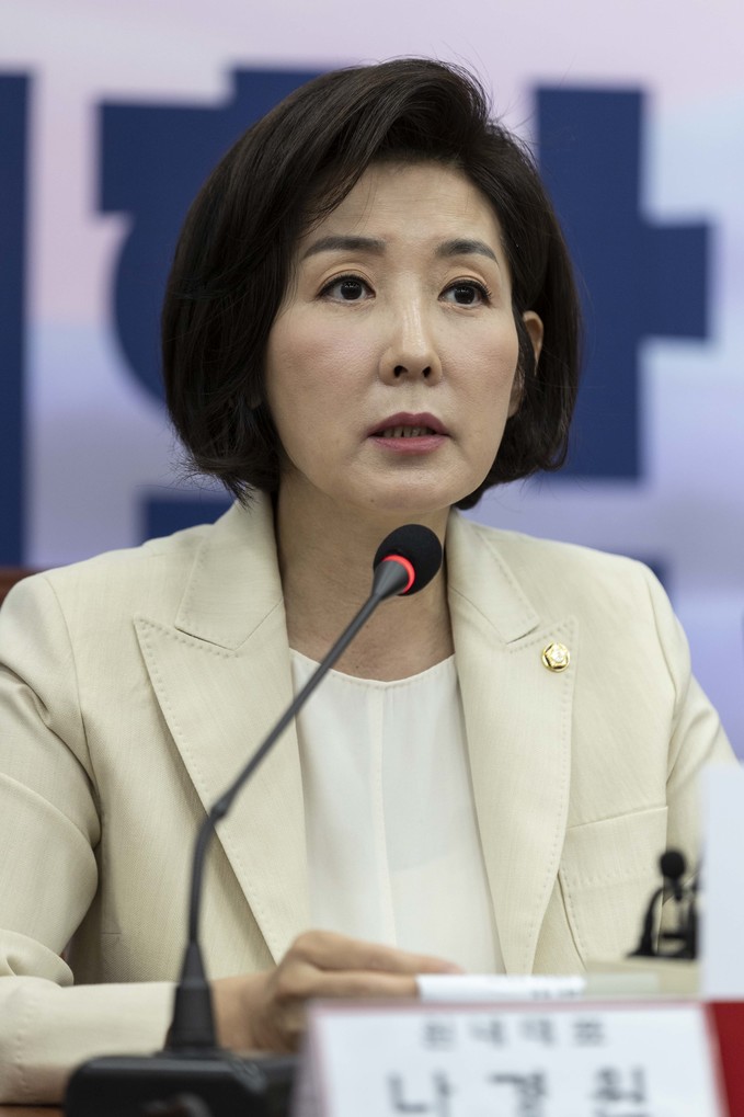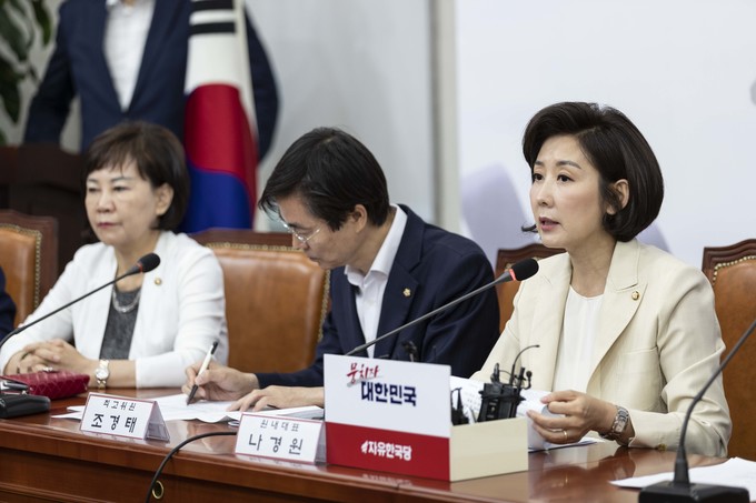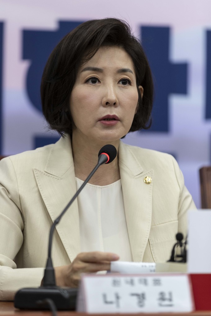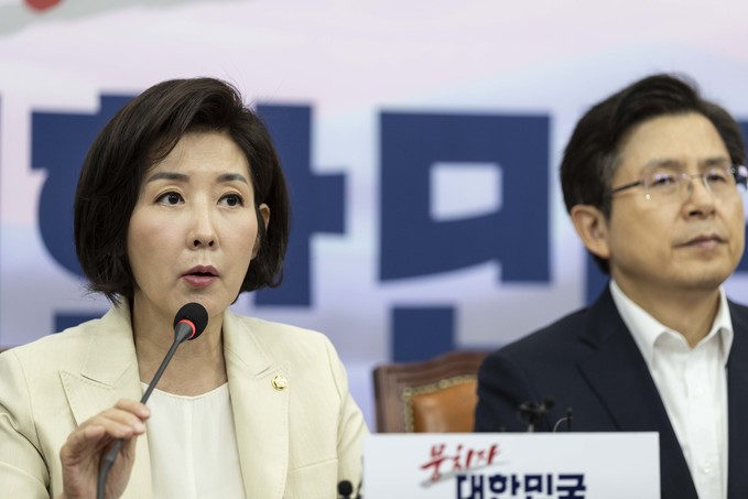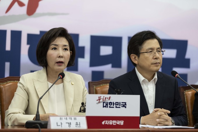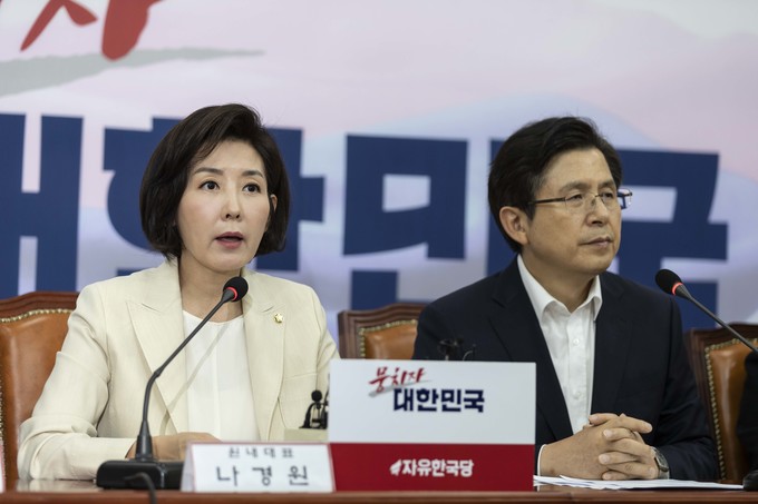 자유한국당 나경원 원내대표(왼쪽)가 7일 오전 서울 여의도 국회에서 열린 한국당 최고위원-중진의원 연석회의에 참석해 발언하고 있다.