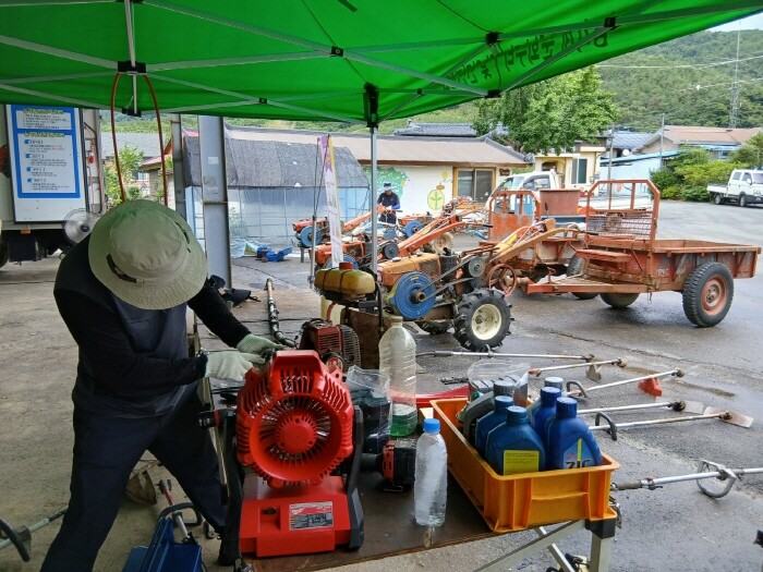 | ▲ 15일 대곡면 유동마을에서 농기계 순회수리 작업이 이뤄지고 있는 모습 [진주시 제공] |