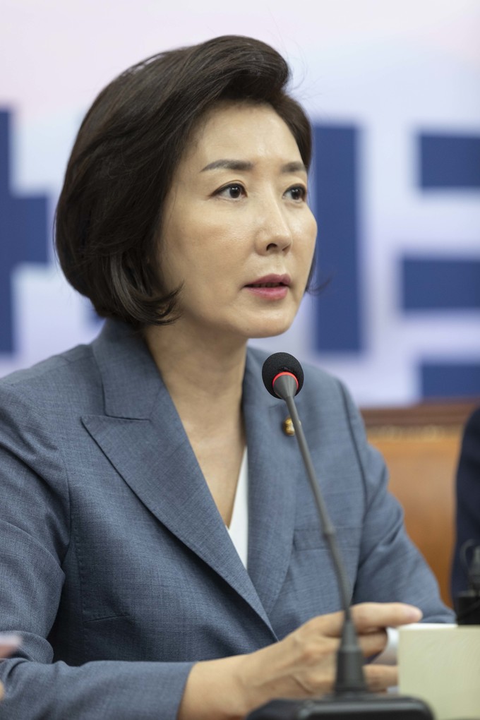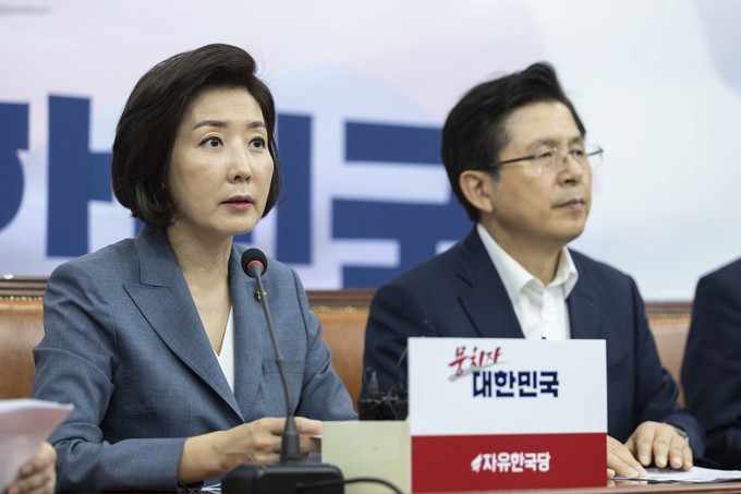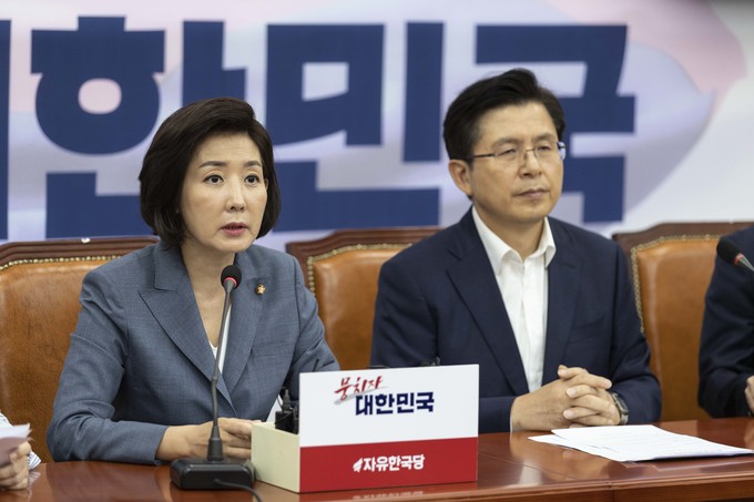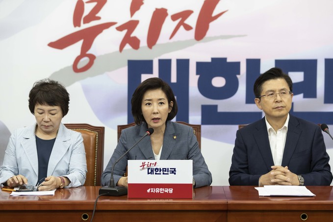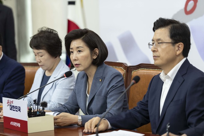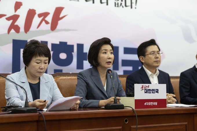 자유한국당 나경원 원내대표(가운데)가 19일 오전 서울 여의도 국회에서 열린 한국당 최고위원회의에 참석해 발언하고 있다.