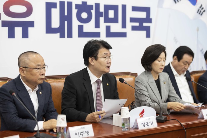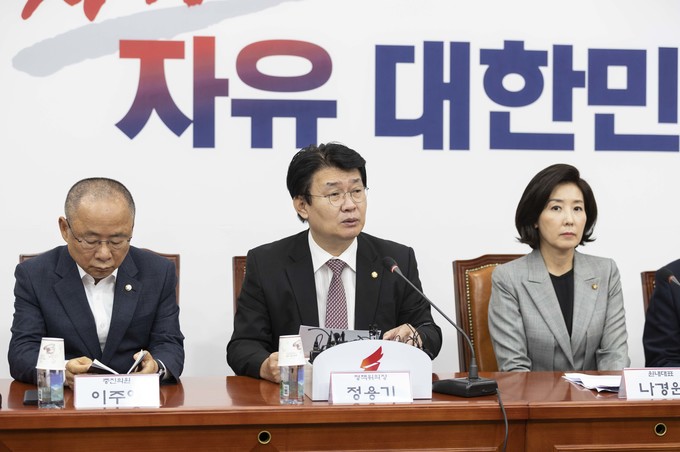 자유한국당 정용기 정책부의장(가운데)이 25일 오전 서울 여의도 국회에서 열린 한국당 원내대표-중진의원 회의에 참석해 발언하고 있다.