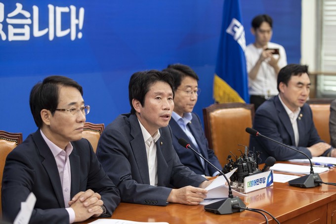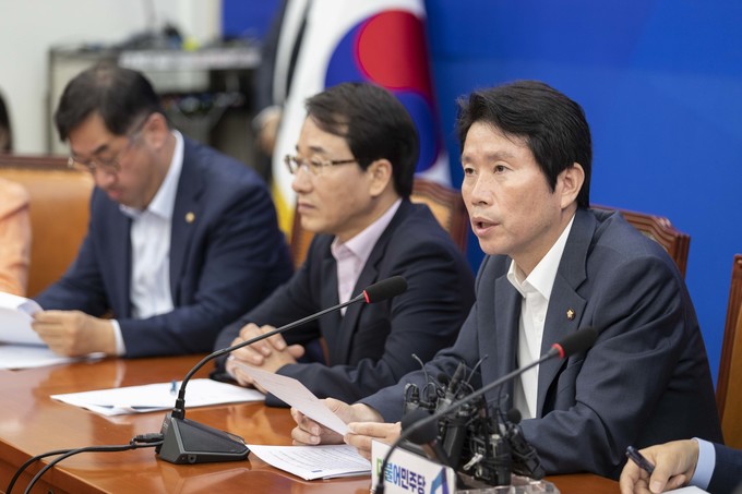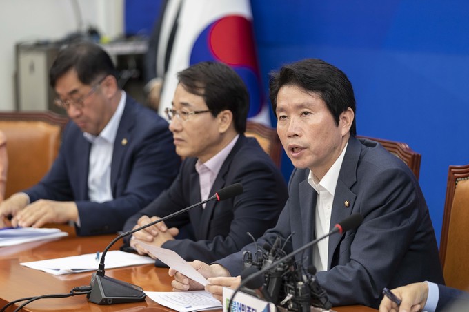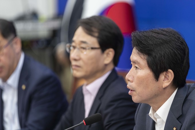 더불어민주당 이인영 원내대표(가운데)가 27일 오전 서울 여의도 국회에서 열린 민주당 원내대책회의에 참석해 발언하고 있다.