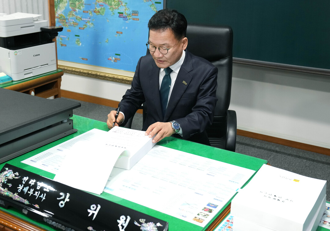 | ▲ 제14대 강위원 전라남도 경제부지사가 17일 집무실에서 인계인수서에 서명을 하고 있다. [전남도 제공] |
