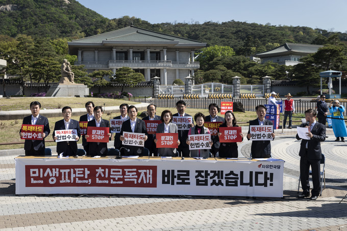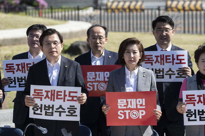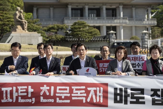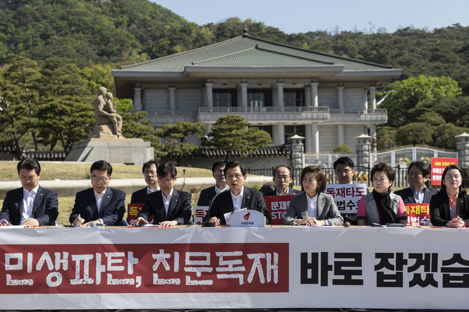2일 오전 서울 청와대 앞 분수대 광장에서 열린 자유한국당 최고위원회의에서 황교안 대표, 나경원 원내대표 등 소속의원들이 구호를 외치고 있다.